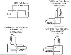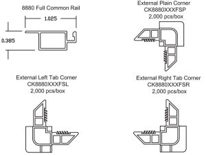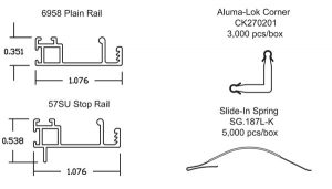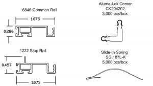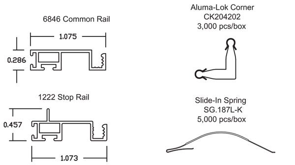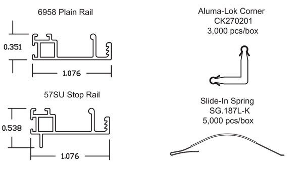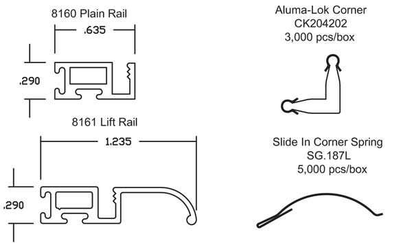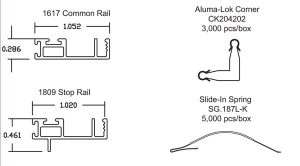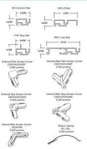 Plain (Common) Rails, Lift rails, Stop rails, and Lock rails available in many different styles and stocked colors.  Matching hardware (Internal or External nylon corners, zinc corners (where available), leaf springs and pull tabs) shown below each screen rail for convenience.